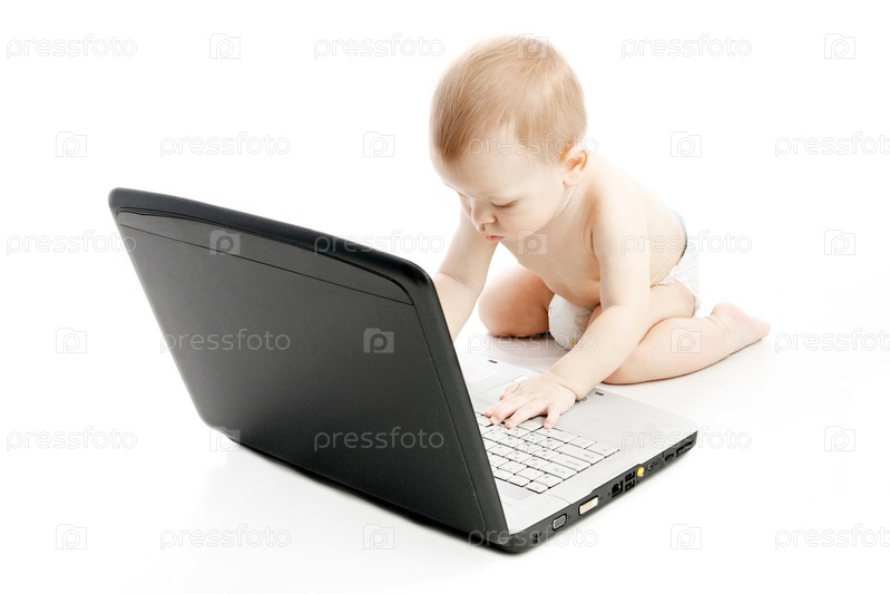 Ребенок использует ноутбук над белым