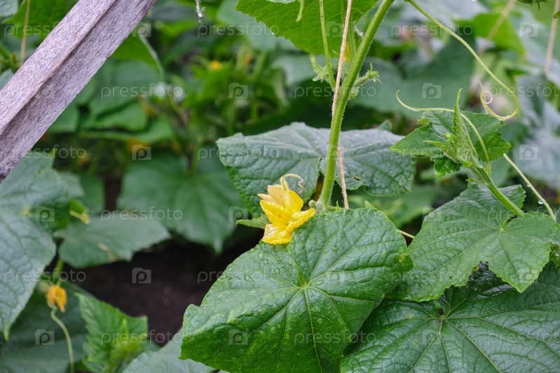 Молодой огурец с желтыми цветами. макрос крупным планом на фоне листьев