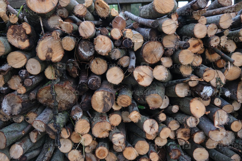 Дрова, приготовленные на зиму под дождем, мокрые бревна на улице сложены друг на друга, пространство для копирования с избирательным фокусом