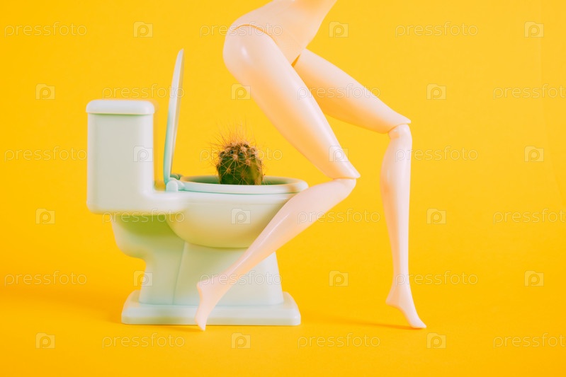 Концепция геморроя, кукла сидит на миниатюрном унитазе с кактусом внутри