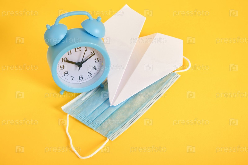 Будильник, бумажный самолетик и медицинская защитная маска для лица на желтом фоне копируют космическую блокировку и концепцию туризма