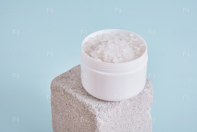 Натуральный здоровый органический косметический продукт для оздоровления и релаксации. морская соль для ванн в пластиковой белой банке на каменном подиуме на синем фоне