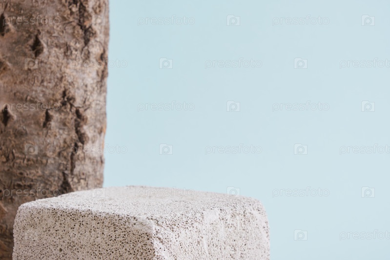 Бетонные пустые подиумы и кора дерева на голубом фоне. Макет продуктовых стендов