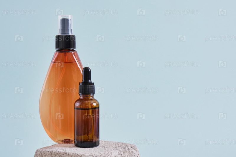Стеклянная бутылка-капельница и спрей косметический флакон на бетонном подиуме натуральная косметика и концепция ухода за телом