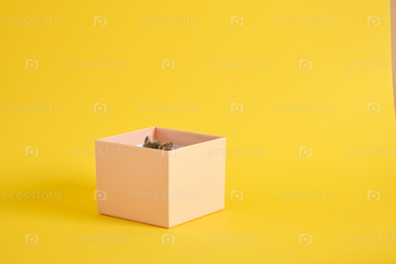 Милый хомяк в подарочной коробке желтом фоне. копировать пространство