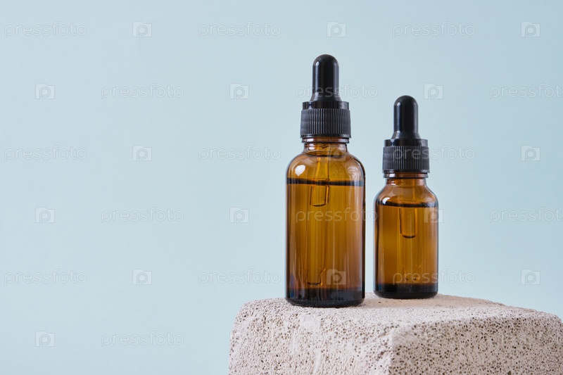 Макет набора пустых косметических контейнеров с пипетками из янтарного стекла на голубом фоне, концепция естественного ухода за кожей