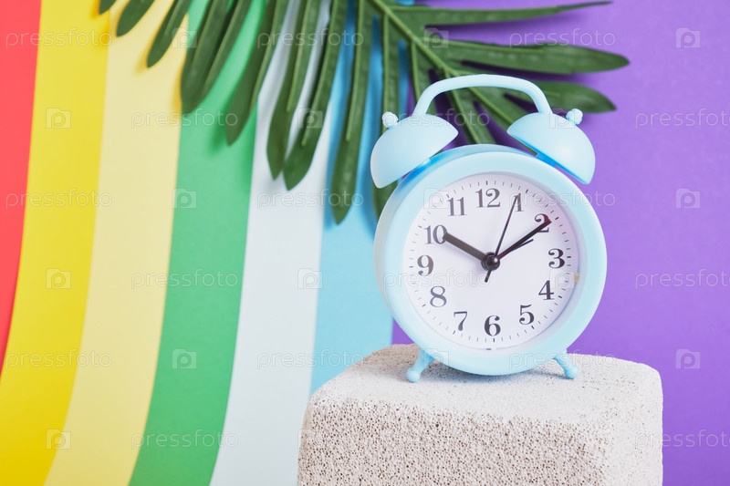 Синий будильник на цветном радужном фоне копией пространства