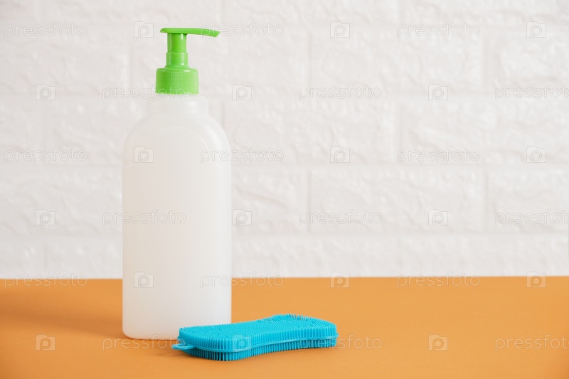 Пластиковая пустая бутылка с дозатором для мыла или моющего средства для мытья посуды и силиконовой губкой для чистки на столе на фоне белой кирпичной стены макет