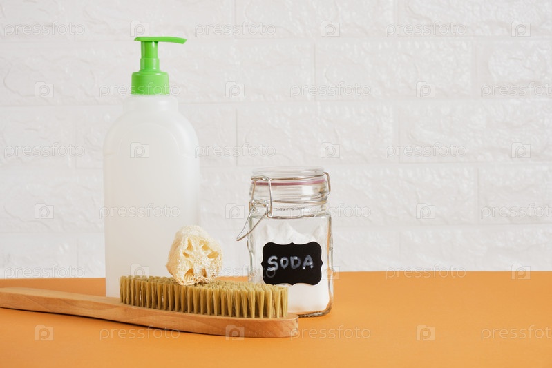 Щетка, банка из-под газировки, пустая бутылка с дозатором для мыла или моющего средства для мытья посуды и люфы, концепция эко-очистки