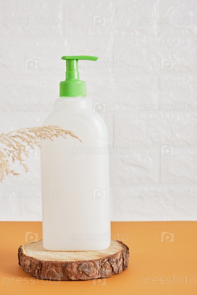 Пластиковая бутылка с дозатором для мыла или средства для мытья посуды на деревянной подставке