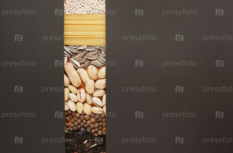 Специи, чай, крупы, орехи, семена и текстура макарон, черная бумага для текста, копия пространства, макет, продуктовая концепция