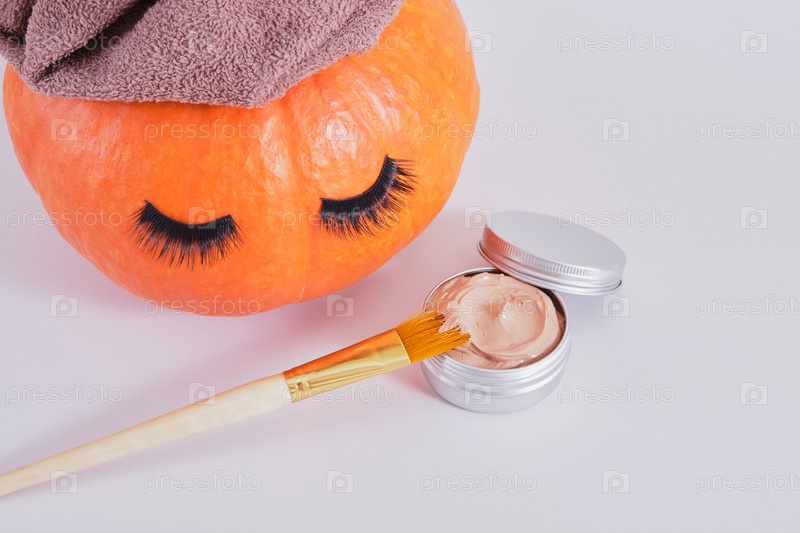 Кисть, алюминиевая банка с косметической глиняной маской для лица и оранжевая тыква с полотенцем и накладными ресницами на сером фоне