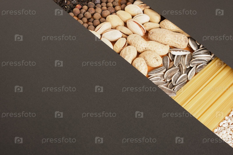 Специи, чай, крупы, орехи, семена и текстура макарон, черная бумага для текста, копия пространства, макет, продуктовая концепция