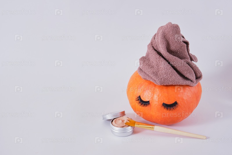 Кисть, алюминиевая банка с косметической глиняной маской для лица и оранжевая тыква с полотенцем и накладными ресницами на сером фоне