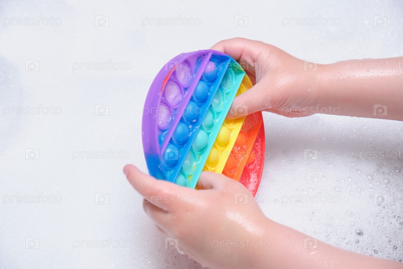 Ребенок держит в руках антистрессовую игрушку с силиконовыми пузырьками, втыкая ее в мыльную пену