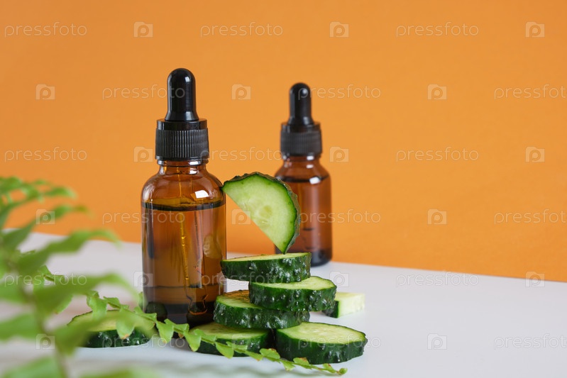 Листья папоротника, ломтики огурца и бутылки из коричневого стекла на сером и коричневом фоне, концепция натуральной косметики