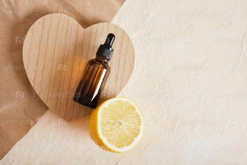 Лимонная и коричневая стеклянная бутылка с капельницей для сыворотки или косметического масла на деревянном подиуме в форме сердца,