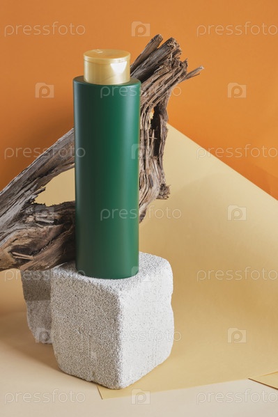 Зеленая бутылка для шампуня или бальзама для волос на бетонном подиуме на деревянном фоне коряги, коричневый фон