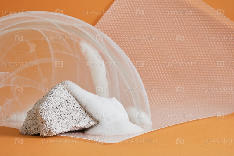 Фрагмент бетонного блока, стеклянный арочный подиум и мыльная пена на коричневом фоне, белый макет фона для вашего продукта Косметический макет косметического продукта. Копировать пространство