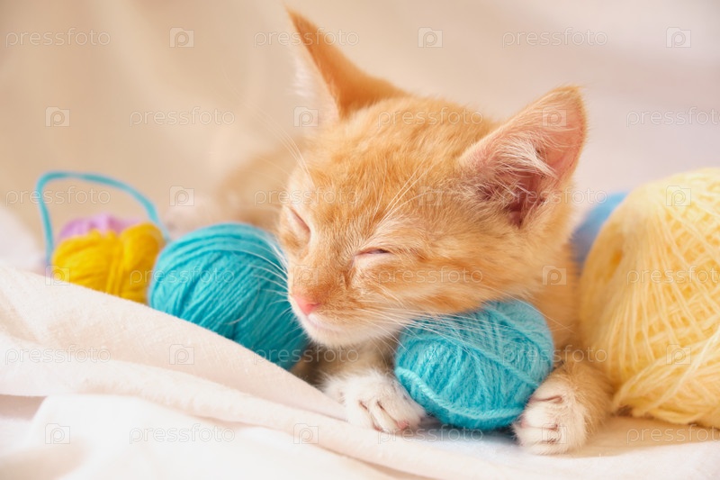 Милый рыжий кот и разноцветные клубки ниток на фоне белого постельного белья, котенок сладко спит после игры с нитками на кровати