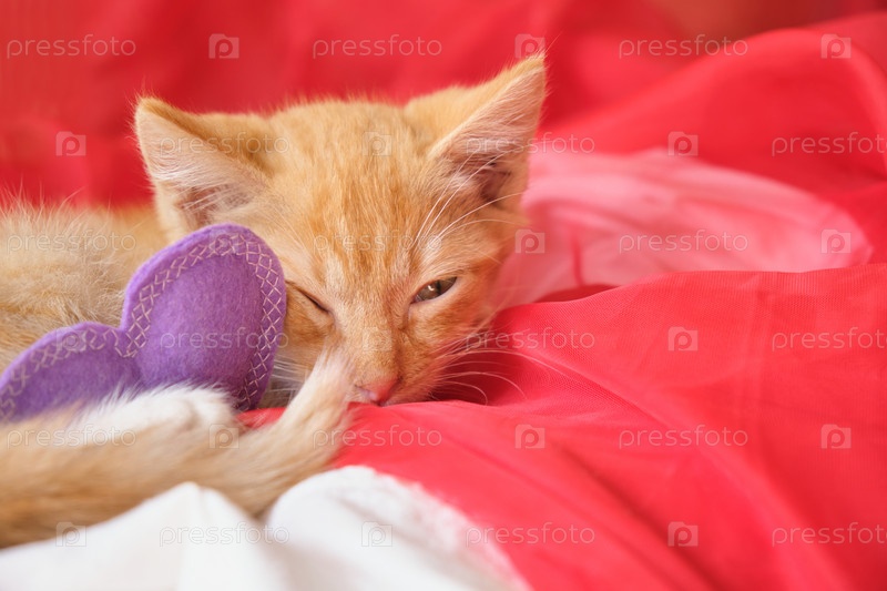Сердце из фетра и милый рыжий котенок лежат на красной воздушной ткани