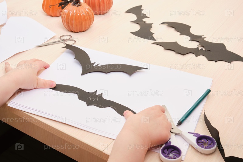 Декор ручной работы на Хэллоуин. ребенок вырезает летучую мышь из черной бумаги