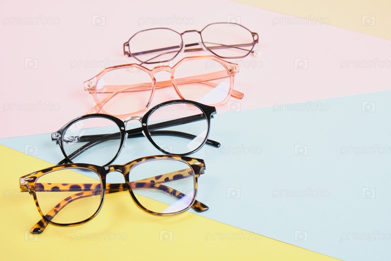 Несколько очков на разноцветном фоне пастельных тонов, геометрический фон, розово-желтый и голубой цвета, модные оправы для очков