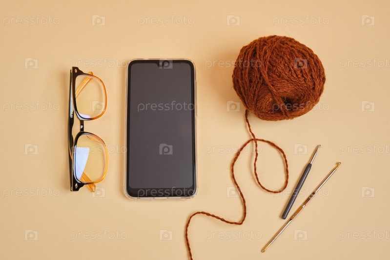 Смартфон, очки и крючки и нитки в корзине на бежевом фоне
