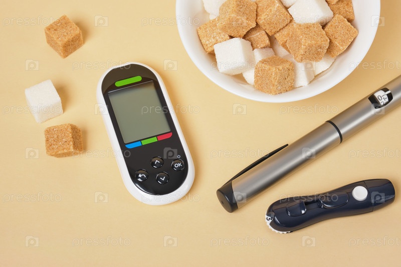 Глюкометр, коричневый тростник и белые кубики сахара в белой миске на бежевом фоне