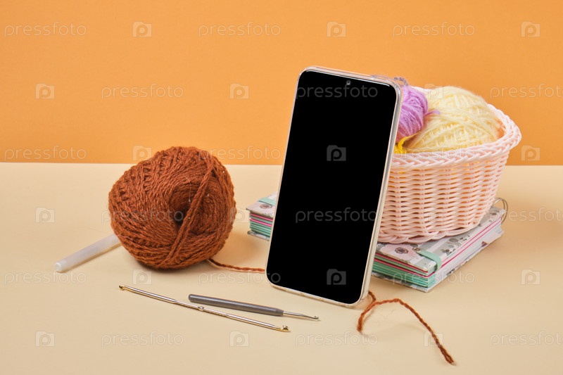 Смартфон, блокнот и вязальные крючки и нитки в корзине на бежевом фоне