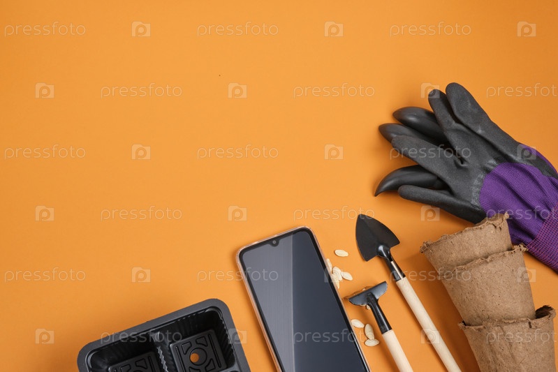 Смартфон и садовая техника на коричневом фоне, концепция блога садовника