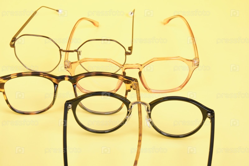 Много модных модных очков для коррекции зрения на желтом фоне