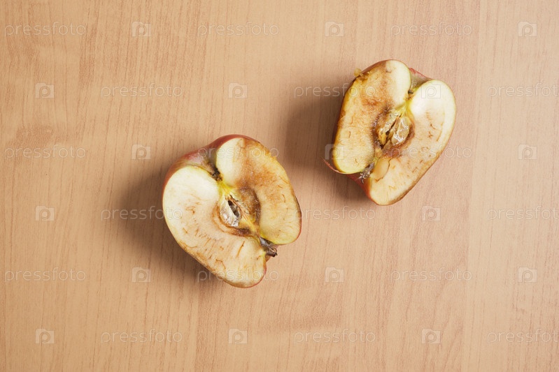 Гнилое яблоко разрезать пополам на деревянном фоне