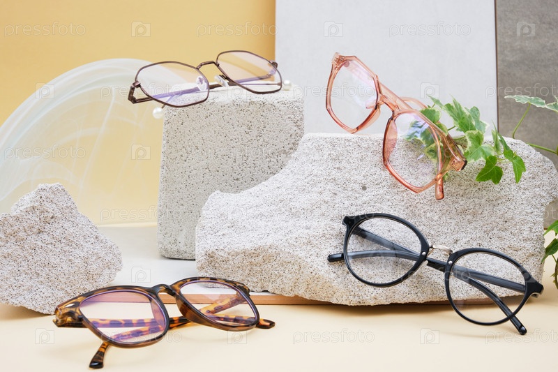 Очки на бетонных подиумах на бежевом фоне, трендовая композиция, стильные очки на бежевом фоне с растениями и плиткой