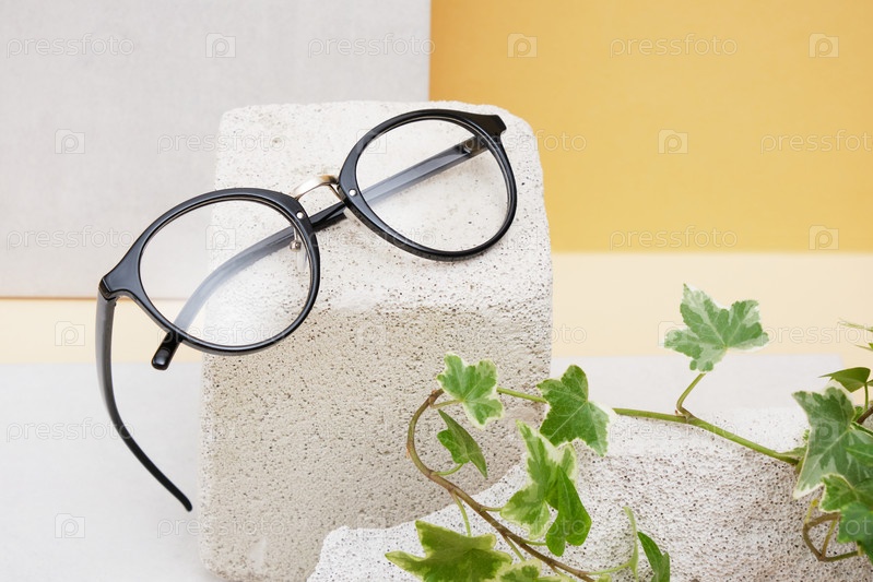 Очки на бетонном подиуме на бежевом фоне, трендовая композиция, стильные очки на бежевом фоне с растениями и плиткой копируют пространство