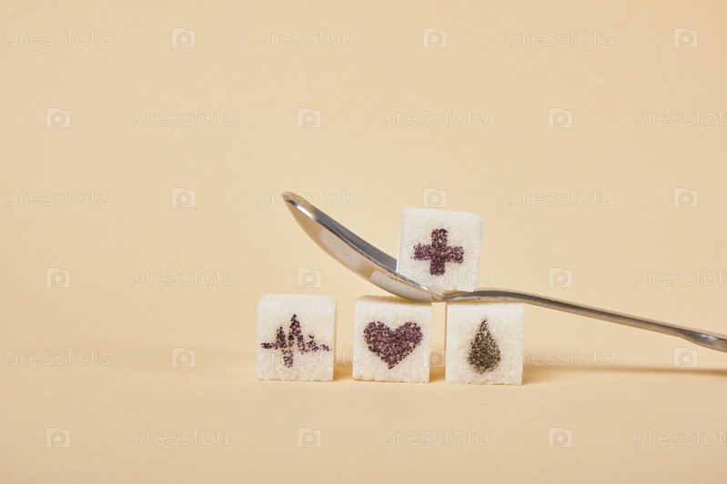 Ложка, полная кубиков сахара на бежевом фоне