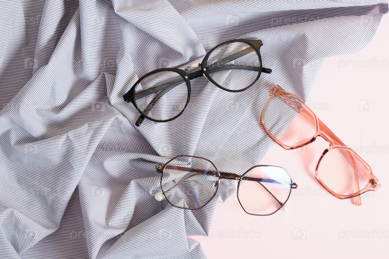 Стильные очки для глаз на полосатой ткани на розовом фоне копией пространства