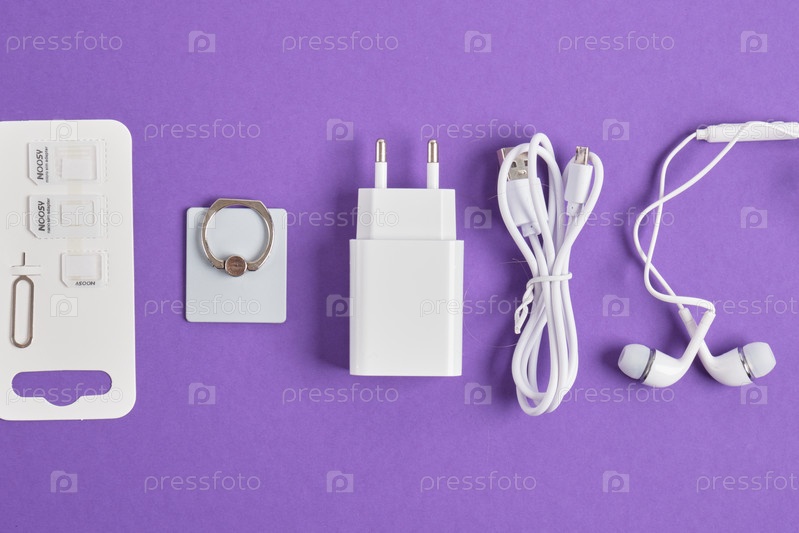 Набор аксессуаров для смартфона, зарядное устройство, наушники, кольцо, адаптеры для сим-карт на фиолетовом фоне