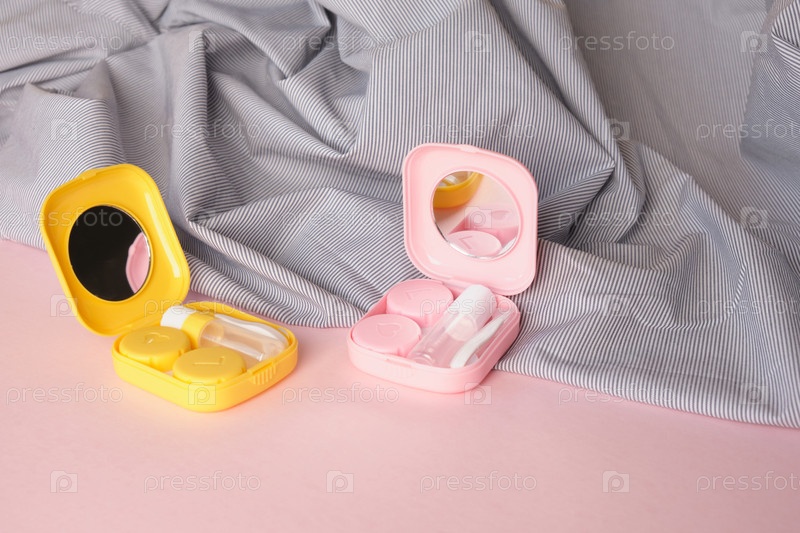 Две красочные коробки для контактных линз с зеркалом, футляр для линз на цветном фоне, набор для ухода за линзами