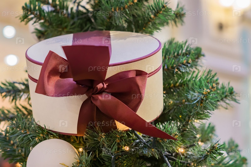 Рождественские и новогодние праздники фон. Рождественская елка с гирляндой и подарочной коробкой с бантом