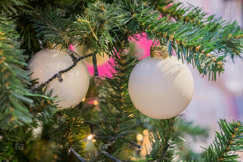 Крупный план елки, украшенной белыми шарами, привел гирлянду. Новогодний фон