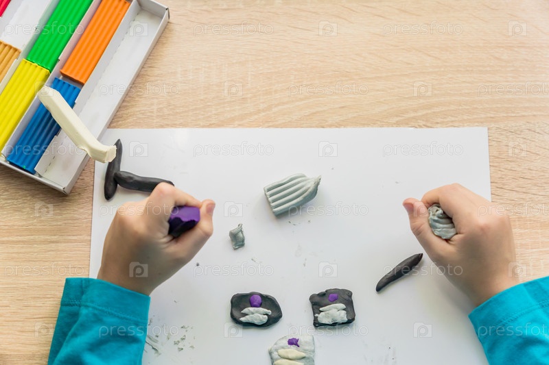 Руки маленького мальчика, играющего с красочной глиной для лепки. Креативная лепка малыша дома