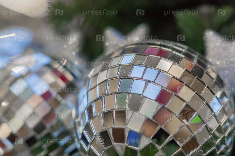 Рождественские и новогодние праздники фон. Рождественская елка украшена серебряным диско-шаром. Концепция праздника