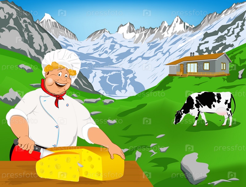 Мужчина повар-сыродел и аппетитный молочный швейцарский сыр с высокогорных альпийских лугов