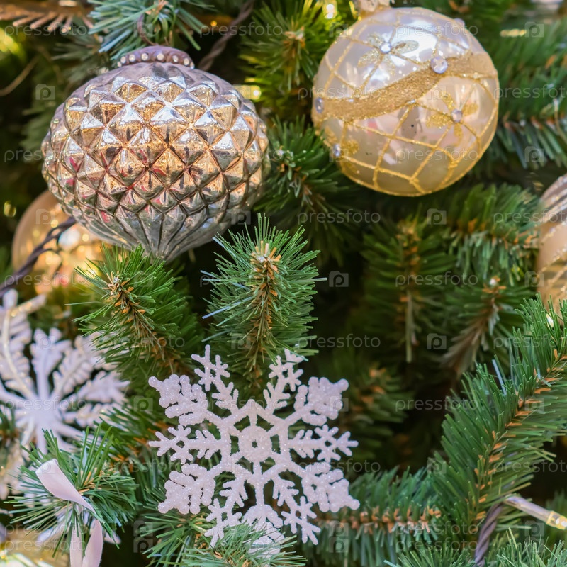 Закройте рождественскую елку, украшенную золотыми и белыми шарами и снежинкой. Новогодний фон