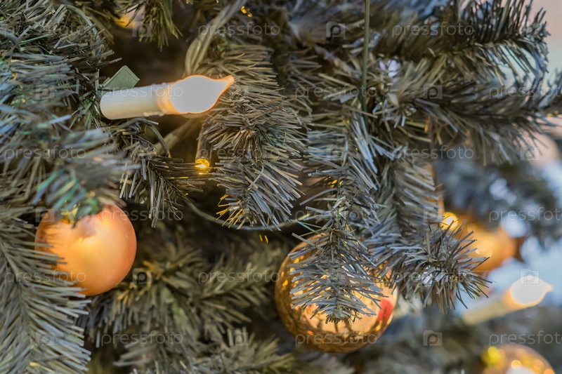 Рождественские и новогодние праздники фон. Рождественская елка украшена золотыми шарами и свечой. Концепция праздника