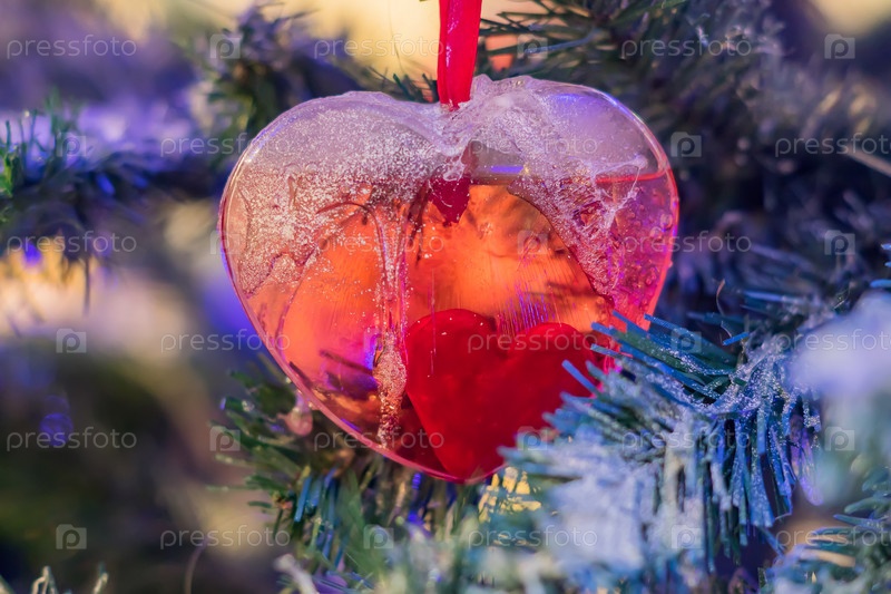 Рождественские и новогодние праздники фон. Рождественская елка украшена красным сердцем. Концепция праздника