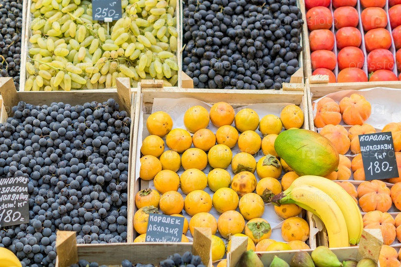 Ассортимент спелых фруктов в деревянных ящиках на российском фермерском рынке