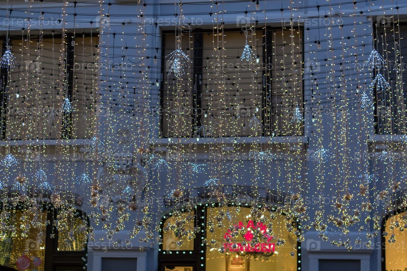 Москва, Россия - 10 января 2018 года: Фрагмент сувенирного магазина на улице Никильской в Москве и рождественские украшения висят над головой