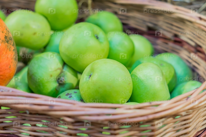 Крупный план зеленых спелых яблок в корзине на фермерском рынке